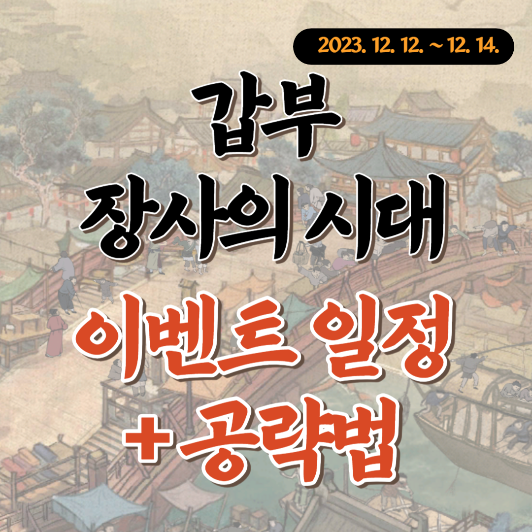 안녕하세요. 모바일게임 갑부 장사의 시대 이벤트 일정을 다음과 같이 공유합니다 :) 이벤트 기간 2023. 12. 18.(월) ~ 12. 20.(수) 월요일 오전 10시부터 수요일 오후 10시까지 이벤트 정보 통합 랭킹 이벤트명 이벤트 내용 친밀도 쟁패 미인 친밀도 증가 랭킹 자녀 쟁패 자녀 혼인 소득 증가 랭킹 문객 및 의상 획득 이벤트명 이벤트 내용 투라세계 문객 '당삼' 획득 문객 당삼 의상 획득 *숨겨진 의상: '쌍신동체', '수라신', '해신' *공개된 의상: '불노당련', '천수수라', '호천주', '남은황' 미인 및 의상 획득 이벤트명 이벤트 내용 - 해당 사항 없음 아이템 획득 이벤트명 이벤트 내용 그림자극 아이템 '나비 그림자' 획득 (미인 친밀도 상승) 투호놀이 아이템 '문객첩 조각',..